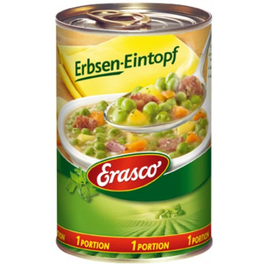 Der leckere Erbsen-Eintopf wird aus aromatischen Erbsen, frischen Möhren- und Kartoffelstückchen und saftigem Schweinefleisch nach dem Erasco Schon-gar-Prinzip zubereitet. Für einen köstlichen, hausgemachten Geschmack.